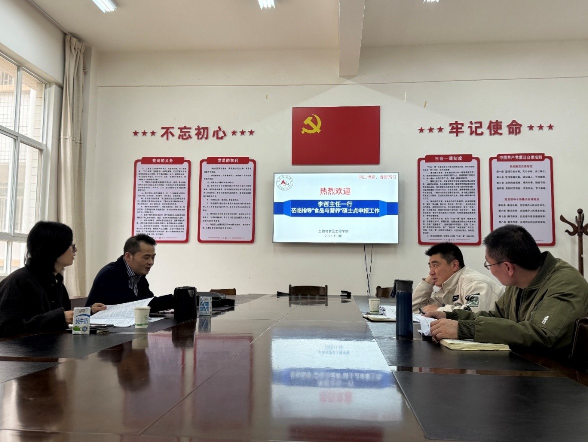 2025年11月8日,学科建设与研究生培养中心李哲主任、陈昱岿副主任、魏玉倩博士一行再次应邀莅临生物与食品工程学院,对“食品与营养”硕士学位授权点申报工作进行了 “一对一”专项指导。学院领导、学位点负责人及骨干教师参与交流。